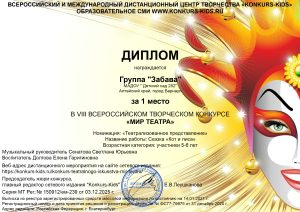 Ребята старшей группы «Забава» под руководством музыкального руководителя Сенатовой С.Ю. и воспитателя Долговой Е.Г. завоевали 1 место во \/||| ВСЕРОССИЙСКОМ ТВОРЧЕСКОМ КОНКУРСЕ «Мир Театра» в номинации «Театрализованное представление» со сказкой «Кот и лиса»