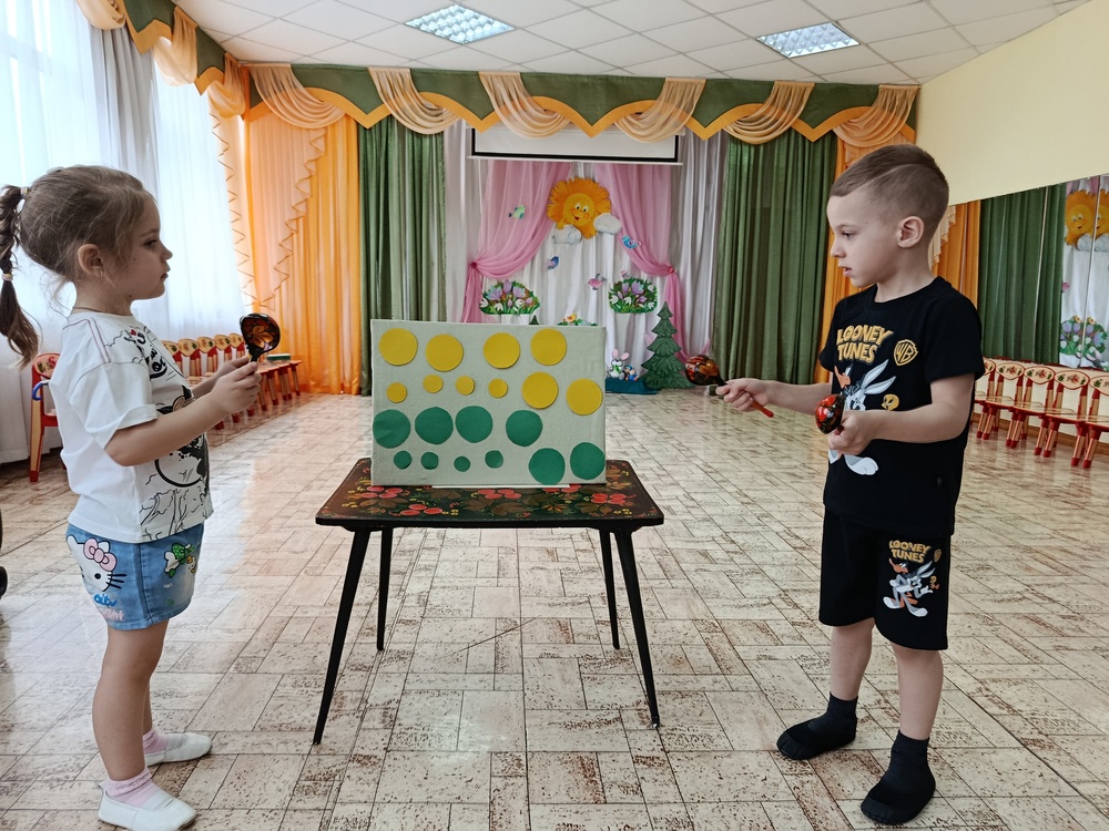 Начиная с первой младшей группы, на музыкальных занятиях ведётся работа по формированию чувства ритма у дошкольников. В этом возрасте используются как нетрадиционные шумовые инструменты, так и самые простые музыкальные: деревянные ложки, бубны, колокольчики. Малыши по показу педагога подыгрывают простейший ритм к весёлому танцу для зверят.
